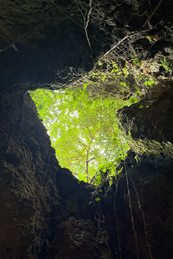 探検気分を味わえる鍾乳洞、出口から見上げる自然の光景、